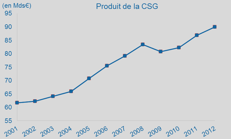 Le produit de la CSG s’élevait en 2013 à 91,5 milliards d’euros, 14 milliards d’euros en plus que les impôts sur le revenu (IR). Une augmentation d’un point de la CSG représente une recette supplémentaire de l’ordre de 11 milliards d’euros.